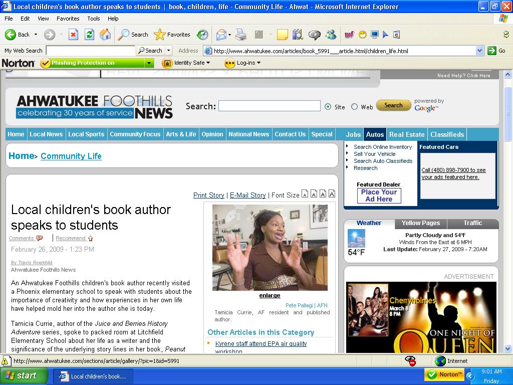 | By Travis Roemheld An Ahwatukee Foothills children's book author recently visited a Phoenix elementary school to speak with students about the importance of creativity and how experiences in her own life have helped mold her into the author she is today. Tamicia Currie, author of the Juice and Berries History Adventure series, spoke to a packed room at Litchfield Elementary School about her life as a writer and the significance of the underlying story lines in her book, Peanut Butter and Sweet Potato Pie. |